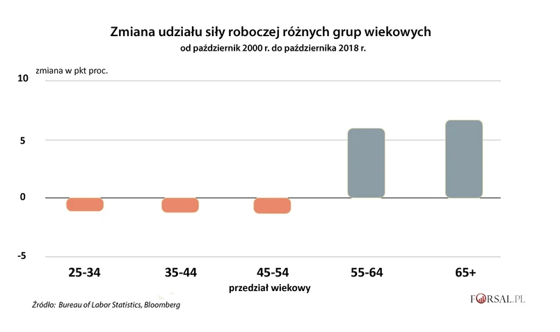 W ostatnich latach w Stanach Zjednoczonych pracownicy w wieku powyżej 55 lat, a zwłaszcza ci powyżej 65. roku życia, coraz częściej pozostawali na rynku pracy. Co ciekawe w niższych grupach wiekowych widoczna jest tendencja odwrotna. Porównanie danych z rynku pracy roku z 2018 roku z rokiem 2000 pokazuje, że aktywność zawodowa spadła we wszystkich grupach wiekowych poniżej 55. roku życia. Skąd taka wzmożona aktywność pracowników tuż przed emeryturą? Może to częściowo wynikać z polityki państwa wobec osób dłużej pozostających na rynku pracy - zauważa Courtney Coile z Wellesley College w najnowszym raporcie National Bureau of Economic Research.