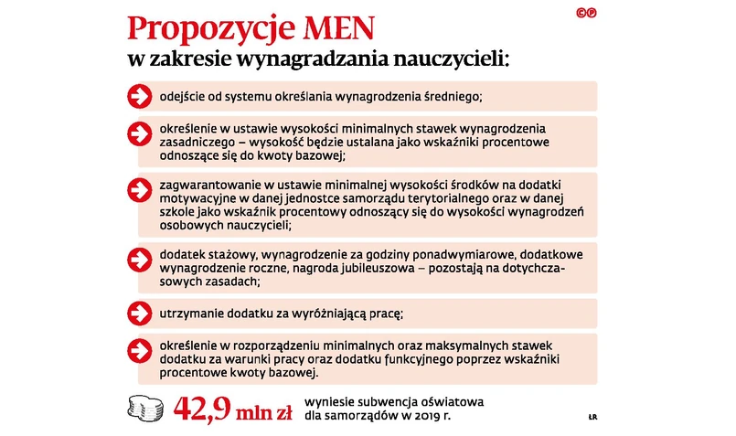Na początku stycznia do konsultacji międzyresortowych trafi projekt ustawy, który zmienia zasady podziału subwencji oświatowej, a także reformuje system wynagradzania nauczycieli. Zabiegały o to m.in. samorządy, ale także oświatowa Solidarność. Obecnie do opiniowania trafiły założenia do projektu, do których dotarł DGP. Na zgłoszenie swoich zastrzeżeń związkowcy mają czas do 10 grudnia 2018 r. Zmiany miały być uchwalone już przed rokiem, ale na prośbę lokalnych władz MEN się z nich wycofało. Tłumaczyło, że w tym samym czasie weszłoby zbyt wiele rewolucyjnych rozwiązań w oświacie, pozostało więc tylko przy wygaszaniu gimnazjów. Z założeń do projektu ustawy, wynika, że zmiany będą wchodziły w życie etapami, tak aby samorządy mogły się uporać z tworzeniem większej liczby oddziałów i rozbudową placówek. Premiowane mają być bowiem kameralne klasy.