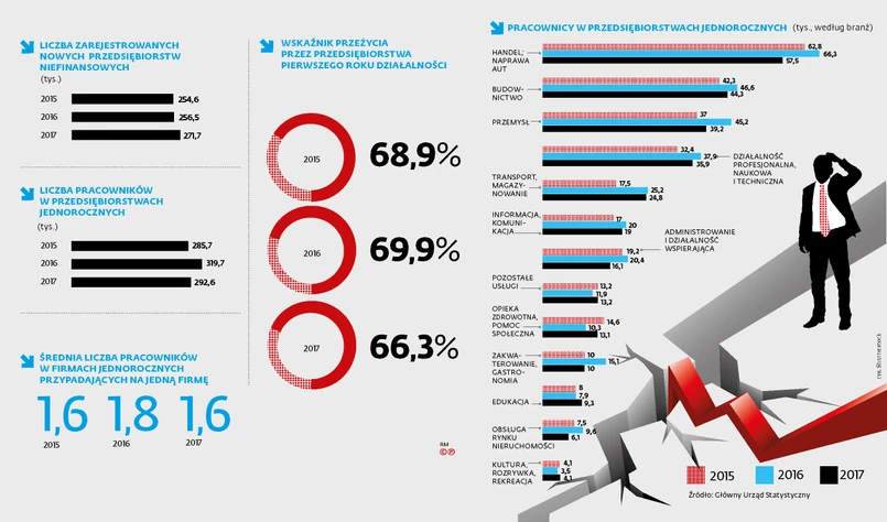 To ostra konkurencja na bardzo mocno nasyconym rynku oraz szybko rosnące płace i problemy z pozyskaniem pracowników. Ekonomistka podkreśla, że do wzrostu liczby firm, które nie przetrwały roku, mogła się przyczynić poprawa na rynku pracy. – Dziś można wręcz przebierać w ofertach zatrudnienia, dlatego mali przedsiębiorcy nie starają się już za wszelką cenę utrzymać swoich firm, gdy przynoszą niewielkie zyski. Bo praca na etacie w obcej firmie może im przynosić większy zarobek – podkreśla Kryńska.