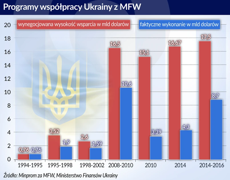 Zdaniem ekonomisty Aleksieja Kuszcza Kijów w ogóle ma problem ze współpracą z MFW. Z dotychczasowych sześciu programów w pełni wykonano tylko jeden — pierwszy, jaki przewidywał wsparcie dla reform systemowych skierowanych na przechodzenie z gospodarki sowieckiej do wolnorynkowej. W ramach tego programu w latach 1994-1995 nasi wschodni sąsiedzi otrzymali 780 mln dolarów.