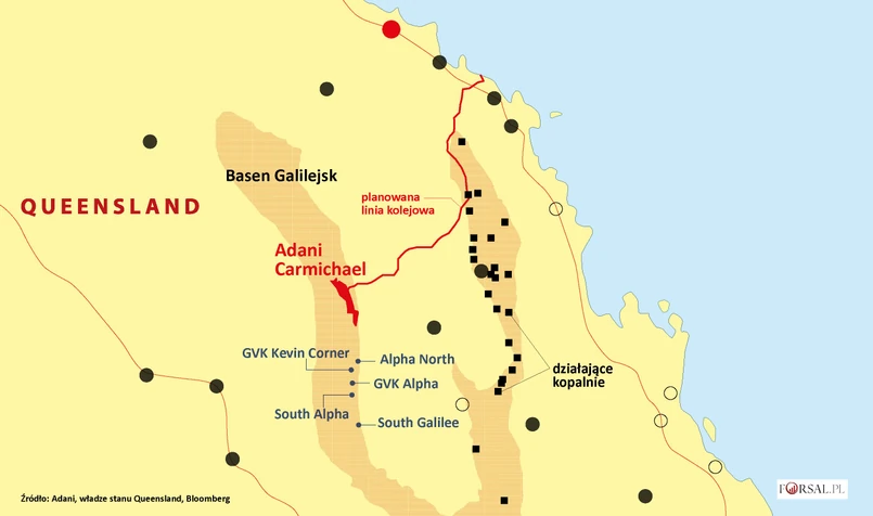 Gigantyczna inwestycja Carmichael indyjskiego miliardera Gautama Adani, uważana przez Międzynarodową Agencję Energetyczną za "prawdopodobnie najbardziej kontrowersyjny projekt węglowy, który jest obecnie rozwijany", zlokalizowana jest w ogromnym australijskim Basenie Galilejskim w stanie Queensland obejmującym około 250 tys. kilometrów kwadratowych, czyli mniej więcej tyle, co powierzchnia Wielkiej Brytanii.