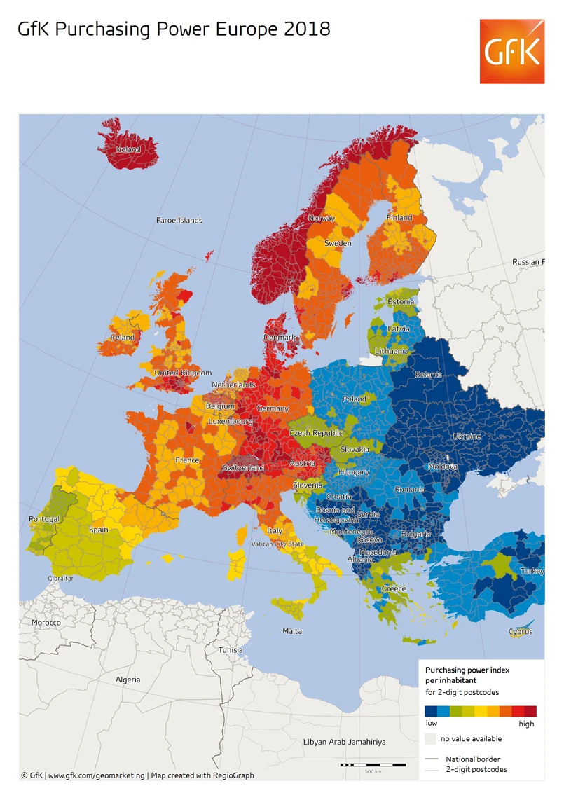 Badanie GfK Purchasing Power Europe 2018 dostępne jest dla 42 krajów europejskich, ze szczegółowymi danymi na temat regionów, do poziomu gmin i kodów pocztowych, wraz z idealnie dopasowanymi danymi dotyczącymi mieszkańców i gospodarstw domowych oraz mapami cyfrowymi.