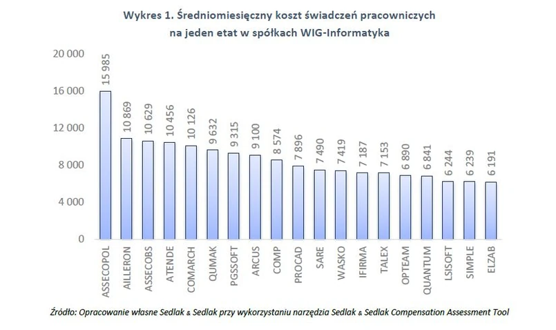 Kolejnym punktem odniesienia jest udział świadczeń pracowniczych w całości kosztów firmy. Struktura kosztów stanowi ważną informację o tym, w jaki sposób wydatkowane są środki w spółce. W czterech z nich nakłady na świadczenia pracownicze stanowią większość kosztów (ich udział jest wyższy niż 50%). Płacące najhojniej (w przeliczeniu „na głowę”) Asseco Polska znalazło się w tym gronie dopiero na 4 miejscu. Na przeciwległym biegunie znalazły się trzy spółki, w których udział świadczeń pracowniczych nie przekroczył 20%. Były to kolejno: OPTeam, Arcus oraz Atende. Różnice te wynikają przede wszystkim z profilu działalności danej organizacji.