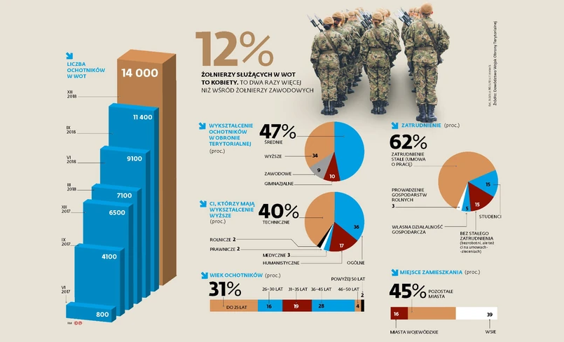 Wbrew pierwotnym obawom ochotników nie brakuje, choć jest to regionalnie zróżnicowane. Na przykład tam, gdzie już wcześniej istniały jednostki wojskowe, chętnych jest mniej. Wydaje się również, że nieuprawniona jest teza o tworzeniu armii bezrobotnych. Tych niemających zajęcia i pracujących na umowę-zlecenie jest w Wojskach Obrony Terytorialnej 15 proc. W WOT służy więcej kobiet niż w pozostałych wojskach. Jest ich aż 12 proc., czyli dwa razy więcej niż wśród żołnierzy zawodowych. Docelowo ten rodzaj wojsk ma liczyć 53 tys. osób, zgrupowanych w 17 brygadach i obecnych w każdym powiecie. Do końca 2019 r. ma być ok. 30 tys. osób.