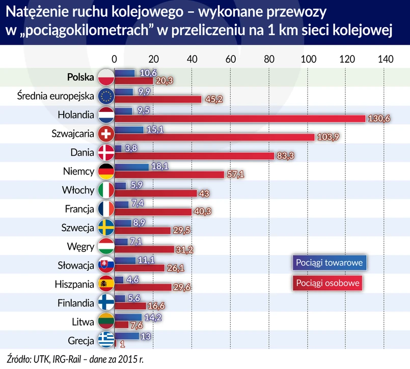 Na koniec trzeba wspomnieć o tym, że polska kolej na razie wykorzystuje tylko niewielką część swego potencjału przewozowego. To widać w statystykach, pokazujących natężenie ruchu kolejowego w krajach europejskich. Polska wypada w nich blado, bo to natężenie jest u nas kilkakrotnie niższe niż w takich krajach, jak Holandia, Szwajcaria, Dania czy Niemcy. Wypadamy też pod tym względem gorzej niż m.in. Włochy, Francja, Szwecja, Hiszpania, Węgry i Słowacja. Widać więc, że nasza kolej jest w stanie odciążać drogi w dużo większym stopniu niż obecnie.