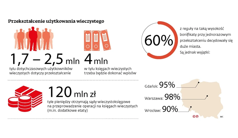 – Pierwsze zaświadczenia będą wysłane jeszcze w styczniu. Postaramy się dochować terminów dotyczących wydawania zaświadczeń, ale nie będzie to łatwe – przyznaje Dariusz Wołodźko z gdańskiego magistratu. Jak wskazuje, skala przekształceń będzie ogromna, bo na terenie Gdańska mieszka ok. 60 tys. użytkowników wieczystych. – Samo rozesłanie zawiadomień będzie nie lada wyzwaniem, prawdopodobnie zatrudnimy do tego studentów czy stażystów. Poza tym wiele terenów nie będzie podlegało przekształceniu, jak np. tereny portowe. Ale też będzie to wymagało przeprowadzenia procedur – mówi.