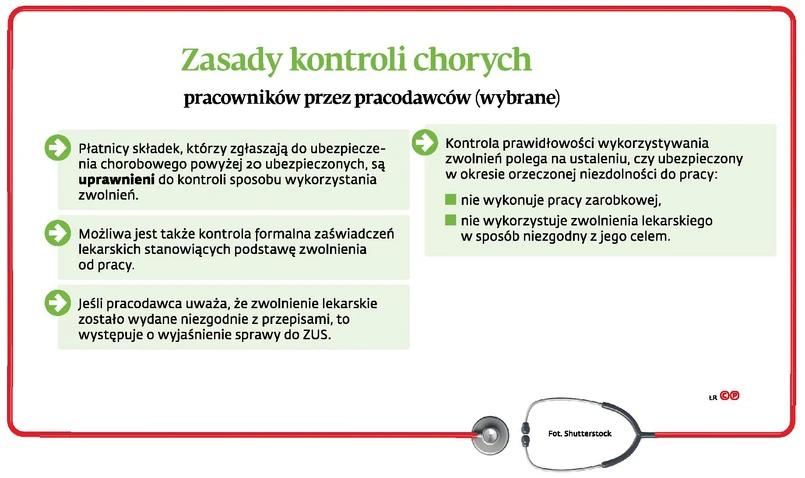 Artykuł 68 ustawy o świadczeniach pieniężnych z ubezpieczenia społecznego w razie choroby i macierzyństwa (t.j. Dz.U. z 2017 r. poz. 1368 ze zm.) jednoznacznie wskazuje, że Zakład Ubezpieczeń Społecznych oraz płatnicy składek są uprawnieni do kontrolowania ubezpieczonych co do prawidłowości wykorzystywania zwolnień od pracy zgodnie z ich celem oraz są upoważnieni do formalnej kontroli zaświadczeń lekarskich.