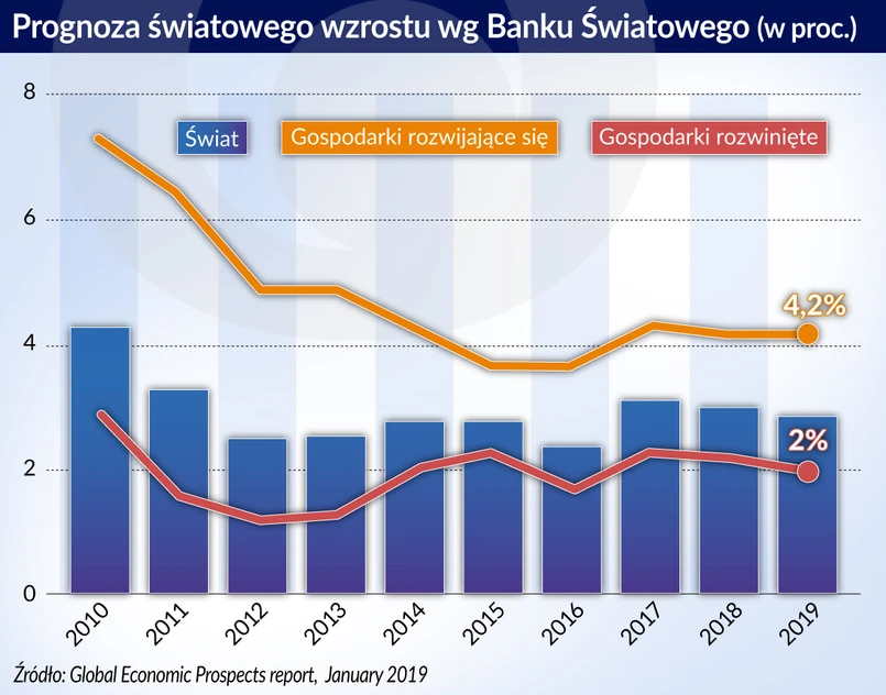 Te prognozy znajdują się w styczniowym raporcie Banku Światowego „Global Economic Prospects”, który ma wymowny podtytuł: „Ciemniejące niebo”. Wzrost w gospodarkach rozwiniętych ma wynieść w tym roku 2 proc., a na rynkach wschodzących 4,2 proc. Cały globalny PKB wzrośnie o 2,9 proc. (w poprzedniej edycji spodziewano się 3 proc.). Nieźle wypada prognoza wzrostu PKB dla Polski, czyli 4 proc. w 2019 roku.