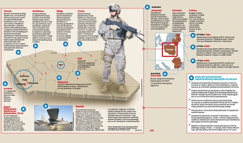 Na infografice zaznaczyliśmy ważniejsze miejsca, w których stacjonują żołnierze USA i Sojuszu, oraz to, jak mogłoby wyglądać wzmocnienie amerykańskiej obecności militarnej w najbliższych miesiącach.