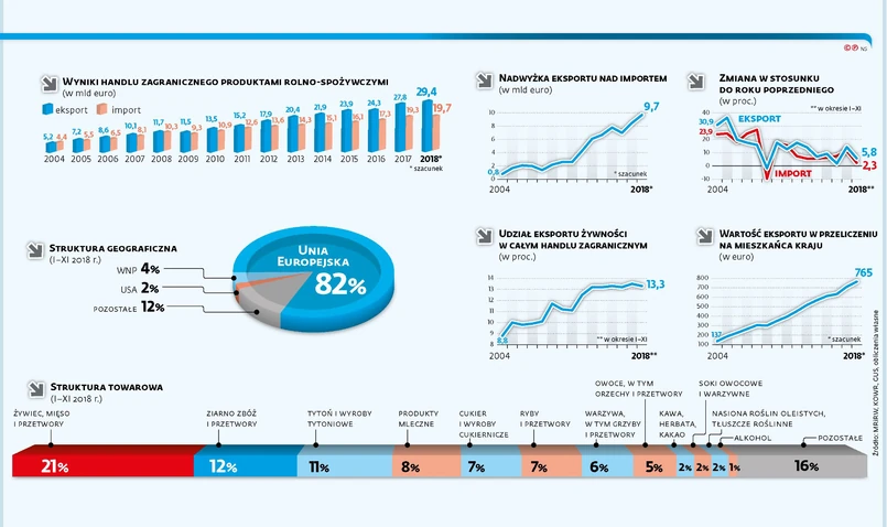 Do tej pory eksport produktów rolno-spożywczych nieustannie rósł (z wyjątkiem 2009 r., gdy w wyniku światowego kryzysu finansowego się skurczył). Ten wzrost to przede wszystkim efekt wstąpienia Polski do Unii Europejskiej. Jej udział w całym eksporcie żywności zwiększył się z 52 proc. w 2003 r. do 82 proc. w ub.r. Dzięki akcesji do UE zniesione zostały cła i kontyngenty na import do krajów Wspólnoty. Krajowe firmy wykorzystały tę szansę. Nie sprawdziły się obawy, że nie sprostają konkurencji na unijnym rynku i że trudno im będzie spełnić występujące na nim wymagania sanitarne i weterynaryjne. ©℗
