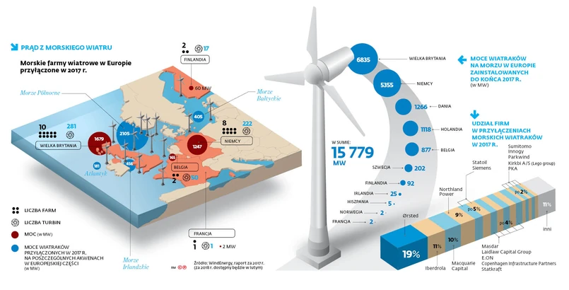 13 firm jest zainteresowanych współudziałem w projekcie budowy farm wiatrowych na Morzu Bałtyckim – zakomunikowała wczoraj Polska Grupa Energetyczna. Najpoważniejszym z graczy, który pretenduje do wejścia w joint venture z PGE, wydaje się duński Ørsted. Po pierwsze, to właściciel 17 proc. wszystkich morskich farm wiatrowych w UE (po 7 proc. mają E.ON, innogy i Vattenfall – dane za 2017 r., tych za 2018 r. jeszcze nie ma). Po drugie, w 2017 r. ta firma przyłączyła do systemu energetycznego aż 19 proc. wszystkich nowych mocy. A po trzecie: dobry jest klimat do rozmów z Duńczykami. Operatorzy gazowych sieci przesyłowych Polski i Danii przygotowują budowę gazociągu Baltic Pipe, który w 2021 r. połączy nasz kraj ze złożami gazu na Szelfie Norweskim. Popłynąć ma nim 10 mld m sześc. gazu rocznie.