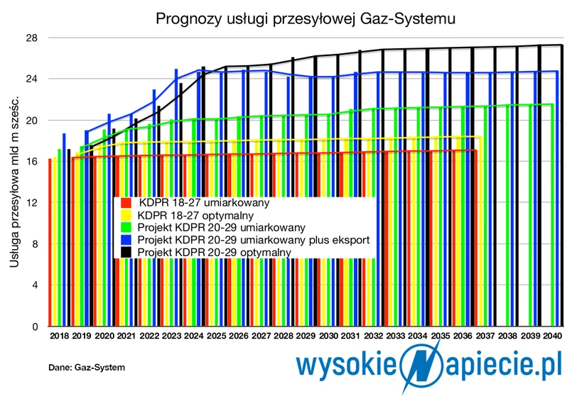 Prognoza na następną dekadę sprzed dwóch lat właściwie już się zdezaktualizowała, obecne krajowe zużycie gazu już ją dogoniło. W nowej wersji jest już znacznie wyższa, mniej więcej o 8 mld m sześc. rocznie. Już w 2020, a najdalej w 2021 r. zużycie ma przekroczyć 20 mld m sześć. rocznie, a docelowo będzie na poziomie 24-26 mld w najwyższym wariancie, określanym przez Gaz-System jako optymalny. Czyli zakładający umiarkowany wzrost gospodarczy przy zwiększeniu popytu na gaz, wynikającym z planów sektora elektroenergetycznego.
