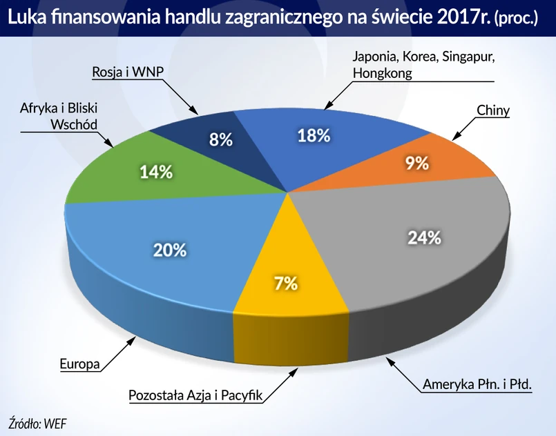 Żmudne, długie i papierowe procesy to jednak nie jedyny problem związany z finansowaniem handlu światowego. Wielu szczególnie małym i średnim przedsiębiorstwom banki nie udzielają wsparcia, bo nie dysponują wystarczającym zabezpieczeniem, nie mają historii kredytowej lub środków na przeprowadzenie transakcji – dotyczy ich aż 74 proc. odmów kredytowania. Skutkuje to luką finansowania, która przez Światowe Forum Ekonomiczne (WEF) szacowana jest (Trade Tech – A New Age for Trade and Supply Chain Finance) na 1,5 biliona dolarów.