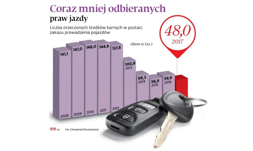 Jeszcze dekadę temu, w latach 2008–2011, sądy zabierały prawo jazdy ponad 140 tys. kierowców rocznie. Jednak od 2010 r. widać wyraźny trend spadkowy. Z najświeższych danych resortu sprawiedliwości z 2017 r. wynika natomiast, że sądy zastosowały środek karny w postaci zakazu prowadzenia pojazdów mechanicznych już tylko niespełna 48 tys. razy.