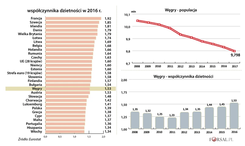 Orban powtórzył apele o powstrzymanie imigracji, określając nadchodzące wybory do Parlamentu Europejskiego jako wybór między siłami promującymi "społeczeństwa mieszane", a ocaleniem chrześcijańskiego dziedzictwa kontynentu. To drugie na razie nie do końca mu jednak wychodzi. Z oficjalnych danych zebranych w ciągu ośmiu lat po powrocie Orbana do władzy wynika, że liczba ludności Węgier spadła o 236 tys. do 9,78 miliona osób. To większy spadek niż w poprzedniej dekadzie. Jest jednak iskierka nadziei, bo w ostatnich latach współczynnik dzietności zaczął rosnąć, choć do pełnego sukcesu jeszcze jest daleko. Według danych Eurostatu w 2011 r. na jedną kobietę na Węgrzech przypadało 1,23 dziecka, podczas gdy w 2016 r. było to już 1,53. Aby liczba mieszkańców kraju utrzymywała się mniej więcej na tym samym poziomie, wskaźnik dzietności musi wynosić nie mniej niż 2,1.