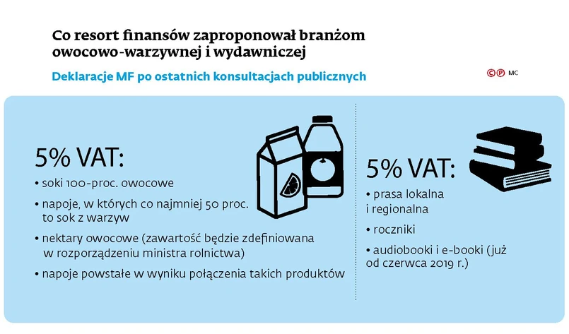 Najmocniejszy sprzeciw zgłaszali producenci nektarów oraz napojów owocowych i warzywnych, bo dla nich projekt oznaczał podwyżkę VAT z 5 do 23 proc. Ostatecznie Ministerstwo Finansów zgodziło się na kompromisowe rozwiązanie. Zgodnie z nową, nieopublikowaną jeszcze wersją projektu stawka 5 proc. VAT obejmie: