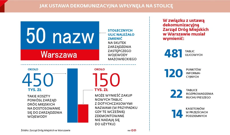 Podobny problem, tylko że o kilkunastokrotnie większej skali, ma też sam stołeczny ratusz. Jak bowiem wyjaśnia nam Katarzyna Gałecka, rzecznik prasowy Zarządu Dróg Miejskich, zmianie uległy nazwy aż 50 ulic. A to pociągnęło za sobą konieczność zaktualizowania wielu oznakowań funkcjonujących w ramach Miejskiego Systemu Informacji.