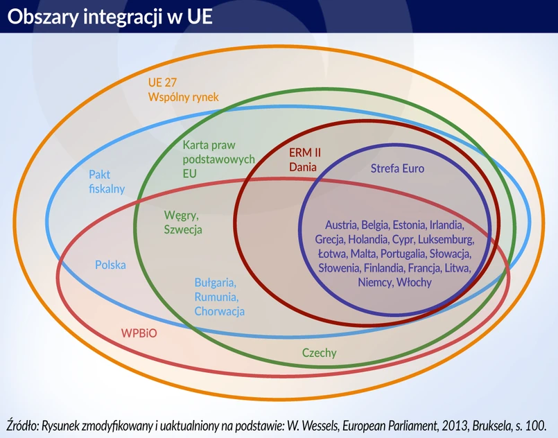 Na przedstawionej ilustracji widać, że w UE wykształciły się dwie grupy państw, różniące się poziomem zaawansowania integracji. Pierwszą tworzą kraje strefy euro. Druga nie jest jednorodna, po wystąpieniu Wielkiej Brytanii będą w niej Polska, Czechy, Węgry, Szwecja, Dania, Chorwacja, Rumunia, Bułgaria. Podstawową różnicą między krajami pierwszej i drugiej grupy jest członkostwo w strefie euro, pozostałe różnice są marginalne.