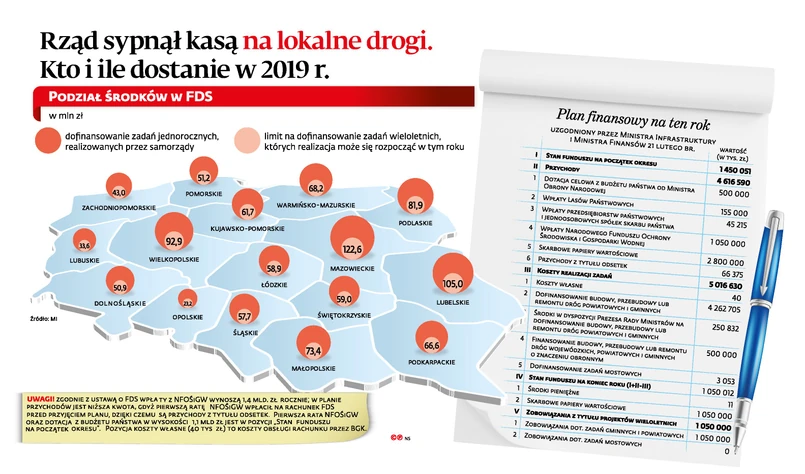 Fundusz Dróg Samorządowych (FDS) to nowy program drogowy przeznaczony dla gmin i powiatów, który – w zamierzeniu – ma zostać następcą popularnego w ostatnich latach programu rozwoju gminnej i powiatowej infrastruktury drogowej (tzw. schetynówek). Pierwsze nabory miały się odbyć w styczniu, jednak pojawił się problem z uzgodnieniem planu finansowego programu przez Ministerstwo Finansów (MF). Bez akceptacji tego dokumentu minister infrastruktury nie mógł oficjalnie poinformować wojewodów o kwotach przypadających na ich regiony, a ci z kolei rozpatrywać wniosków. Do przełomu doszło w ubiegłym tygodniu, gdy oba resorty porozumiały się co do planu. Dzięki temu ustalony został limit wydatków na 2019 r. dla każdego z województw. I tak np. województwo wielkopolskie może liczyć na prawie 377 mln zł dofinansowania do zadań jednorocznych, realizowanych przez samorządy z tego regionu oraz na niemal 93 mln zł dofinansowania zadań wieloletnich, których realizacja może się rozpocząć w tym roku. Łącznie to ok. 470 mln zł. Na dużo mniejsze pieniądze liczyć może np. województwo zachodniopomorskie, któremu przyznano ponad 174 mln zł na projekty jednoroczne i ok. 43 mln zł na wieloletnie, łącznie 217 mln zł (więcej: infografika). W tym roku FDS ma dysponować ponad 6 mld zł. Jednak co ciekawe, nikt – ani strona rządowa, ani część przedstawicieli strony samorządowej – na dziś nie spodziewają się, by cała kwota została wydana. A to za sprawą m.in. oświaty. – W tym momencie jest tak dużym obciążeniem dla samorządów, że nie wiadomo, czy będzie je zwyczajnie stać na wkład własny do projektów drogowych – przyznaje Marek Wójcik ze Związku Miast Polskich. – Poza tym, gdy kończyła się poprzednia kadencja samorządu, mało kto robił dokumentację dla nowych projektów drogowych, więc wniosków może nie być na tyle dużo, by skonsumować pełną kwotę z FDS – dodaje.