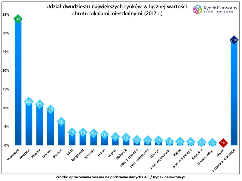 Ciekawe wydaje się także porównanie rocznych zmian udziału poszczególnych metropolii w wartości obrotu lokalami mieszkalnymi. Po zestawieniu wyników dla 2016 roku oraz 2017 roku, uwagę zwraca przede wszystkim wzrost dotyczący Warszawy (z 26% do 34%). Duże wzrosty odnotowano również na terenie Gdańska (+4 punkty procentowe - p.p.) oraz Wrocławia (+3 p.p.). Ogólnie rzecz biorąc, rok 2017 przyniósł dalszą koncentrację obrotu mieszkaniami na największych polskich rynkach.