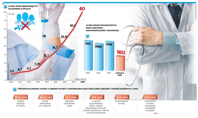 Eksperci przekonują, że takie postawy mają bezpośredni wpływ na pacjentów i trzeba z nimi walczyć. Podobne wnioski płyną z analizy przeprowadzonej przez sanepid. Zgodnie z nią w około 30 proc. rezygnacja ze szczepienia następuje pod wpływem ruchów antyszczepionkowych. Efekty są widoczne gołym okiem. Liczba odmów rośnie z roku na rok. W ubiegłym roku, jak wynika z danych Narodowego Instytutu Zdrowia Publicznego – Państwowego Zakładu Higieny, było ich już 40 tys. Dla porównania na koniec 2017 r. – 30,1 tys.