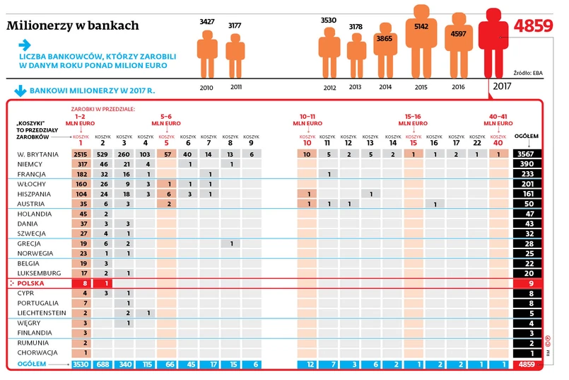 Polska pod względem liczby bankowców o milionowych (licząc w euro) zarobkach znalazła się na 14. miejscu. Według EBA u nas było dziewięć takich osób. Większość z nich można zidentyfikować na podstawie raportów rocznych, w których giełdowe spółki ujawniają wartość wynagrodzeń najwyższej kadry zarządzającej.