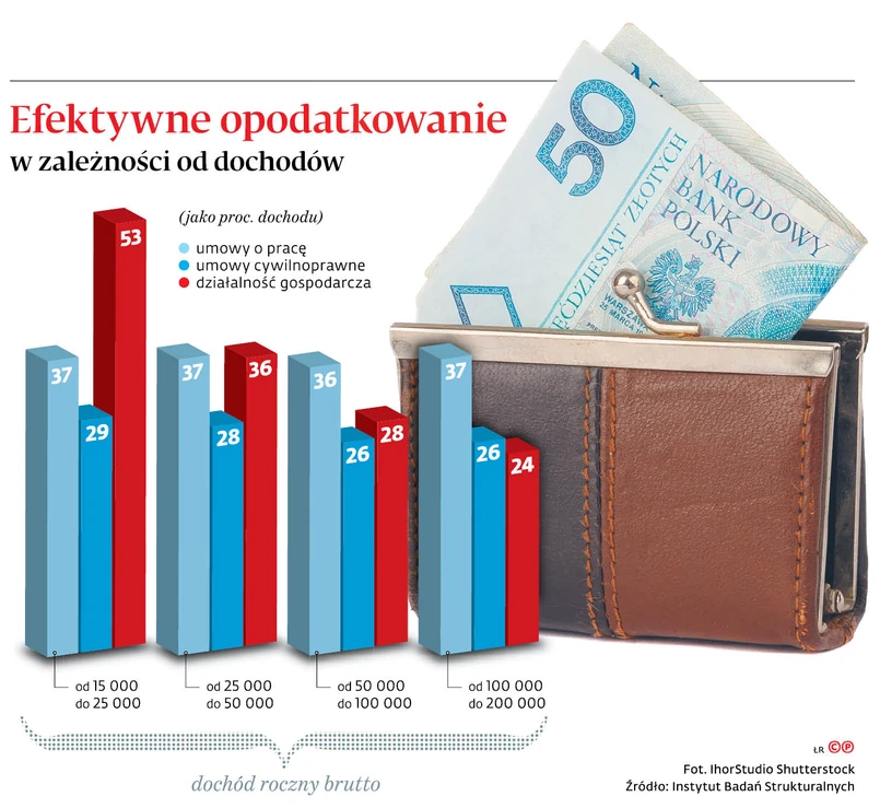 Efektywne opodatkowanie pracy, czyli suma podatków i składek, jaką pobiera się od uzyskiwanego dochodu, w Polsce jest obecnie wyższe niż opodatkowanie działalności gospodarczej – wynika z raportu „Kogo obciążają podatki w Polsce”, który IBS opublikuje dzisiaj. Zatrudnieni na umowach o pracę muszą liczyć się z tym, że państwo zabierze im – niezależnie od tego, ile zarabiają – 36–37 proc. dochodów. Dużo łagodniej fiskus traktuje umowy cywilnoprawne, pobierając od nich 29–26 proc. dochodów. W przypadku działalności gospodarczej efektywne opodatkowanie do tej pory było bardziej zróżnicowane na korzyść osób, które zarabiały dużo.