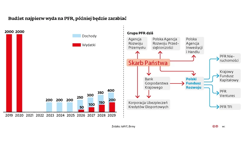 Z załączonej do projektu oceny skutków regulacji wynika, że w pierwszych dwóch latach obowiązywania nowych przepisów PFR miałby być zasilony obligacjami Skarbu Państwa na łączną kwotę 4 mld zł. W końcu 2017 r. (danych za kolejny rok jeszcze nie ma) fundusze własne PFR w ujęciu skonsolidowanym wynosiły 3,4 mld zł.