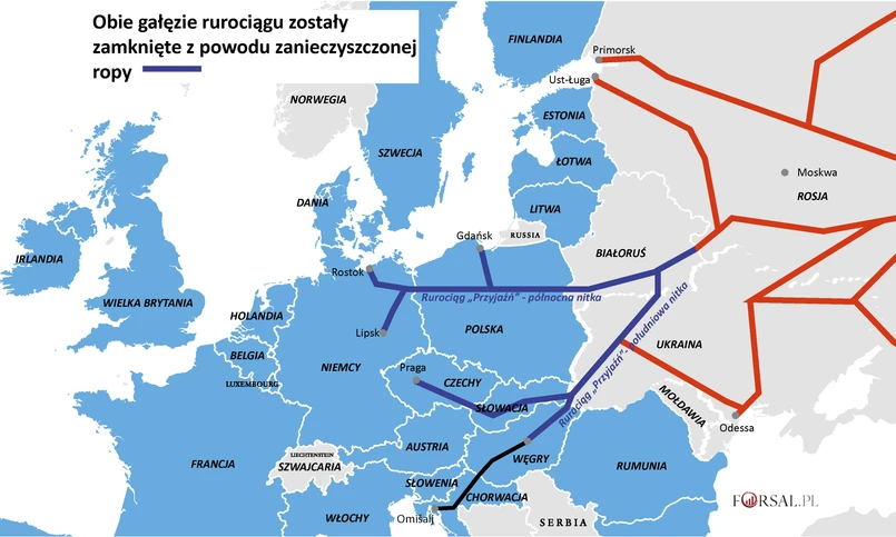 Od 19 kwietnia rurociągiem Przyjaźń na Zachód przez Białoruś płynie zanieczyszczona ropa – odnotowano przekroczenie norm chlorków organicznych w surowcu. Białoruś już mówi o stratach rzędu 100 mln dol. Tamtejsze rafinerie ogrаniczyły produkcję paliw o 50 proc. Tranzyt ropy wstrzymały PERN i ukraińska Ukrtransnafta.