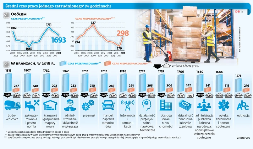 1693 godziny – tyle przepracowała statystycznie w 2018 r. osoba zatrudniona w firmie lub instytucji mającej ponad dziewięciu pracowników. Było to o 0,4 proc. mniej niż w roku poprzednim, przy tej samej liczbie 250 dni roboczych – wynika z najnowszych danych GUS.