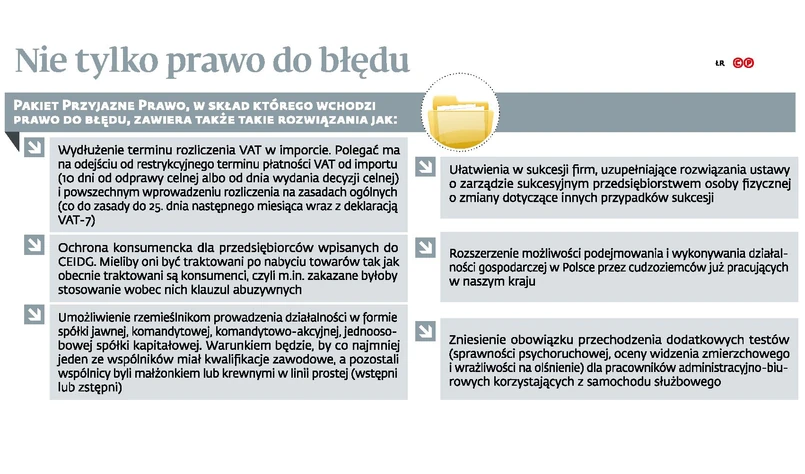 Chodzi o projekt Ministerstwa Przedsiębiorczości i Technologii, który przewiduje prawo do błędu. Miałoby ono polegać na tym, że w przypadku mniej istotnego naruszenia przepisów związanych z wykonywaną działalnością gospodarczą przedsiębiorca nie będzie podlegał karze, jeżeli stwierdzone naruszenie zostanie usunięte w wyznaczonym przez organ kontrolny terminie. Z prawa do błędu mieliby korzystać tylko mikro, mali i średni przedsiębiorcy i jedynie przez rok od założenia działalności. MPiT przewiduje dwa ograniczenia: popełnianie naruszeń po raz kolejny oraz przypadki rażącego naruszenia prawa. W toku konsultacji jednak wiele publicznych podmiotów skrytykowało przygotowane rozwiązanie.