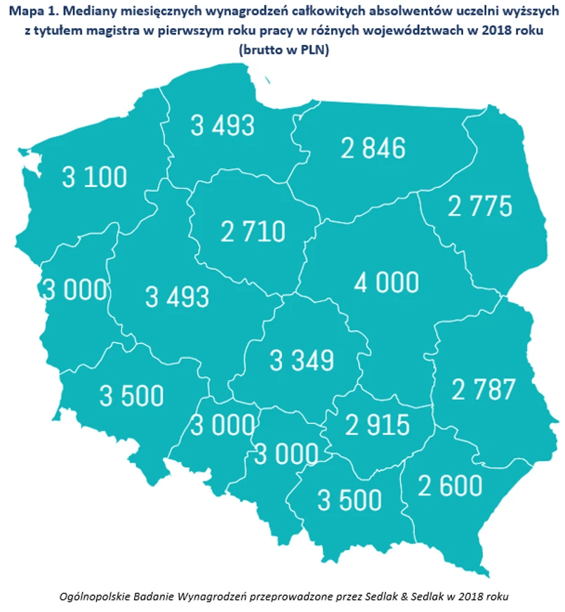 Młodzi magistrzy w pierwszym roku pracy w 2018 roku najwięcej zarabiali w województwach: mazowieckim (4 000 PLN brutto), małopolskim (3 500 PLN brutto) i dolnośląskim (3 500 PLN brutto). Najniższe wynagrodzenia pobierali zatrudnieni w województwach: podlaskim (2 775 PLN brutto), kujawsko-pomorskim (2 710 PLN brutto) i podkarpackim (2 600 PLN brutto).