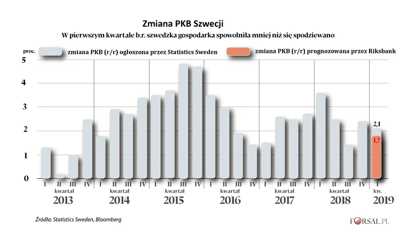 W pierwszym kwartale b.r. PKB wzrósł o 0,6 proc. i 2,1 proc. w porównaniu z rokiem poprzednim, podał w środę szwedzki urząd statystyczny. Ekonomiści przewidywali wzrost odpowiednio o 0,2 proc. i 1,7 proc. Riksbank spodziewał się rocznego wzrostu na poziomie 1,7 proc.