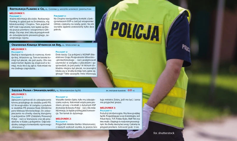 Na nagraniach słychać jak przez całą dobę funkcjonariusze zabezpieczają wybory nie tylko w Warszawie, ale w okolicznych powiatach: piaseczyńskim, wołomińskim, pruszkowskim, mińskim, legionowskim czy nowodworskim. Podobnie jak w ujawnionych przez nas kilka tygodni temu meldunkach z uroczystości z udziałem najważniejszych osób w państwie m.in. prezydenta i premiera, tak i tym razem można było dowiedzieć się co robi szef rządu, o której przybył na wieczór wyborczy w siedzibie PiS przy ul. Nowogrodzkiej, kiedy pojawili się tam inni członkowie jego gabinetu oraz Jarosław Kaczyński. Wiadomo także ilu policjantów zabezpiecza budynek i przyjazd oraz odjazd VIP-ów oraz gdzie będzie jechał premier po zakończeniu wyborczej imprezy w siedzibie partii. Pojawiają się także informacje o liczbie pirotechników pełniących tego dnia dyżur na wypadek podłożenia ładunków wybuchowych.
