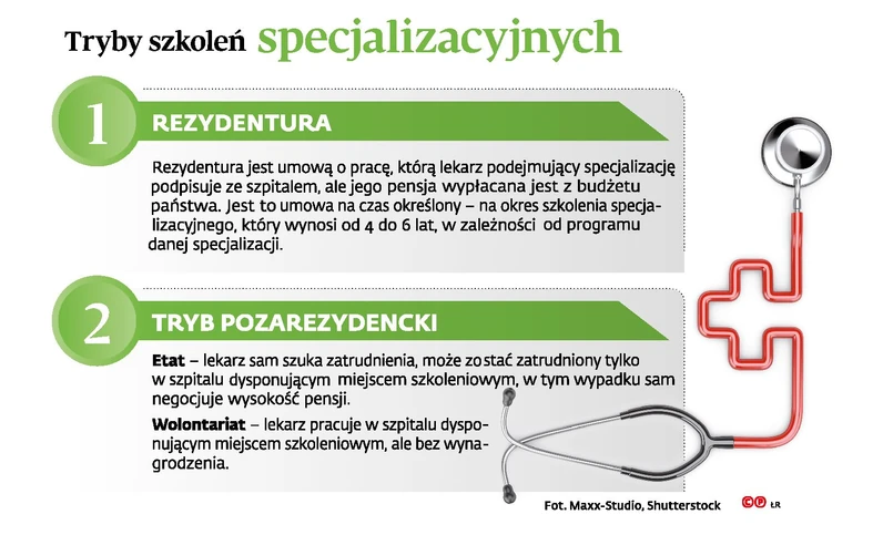 Obecnie specjalizację można odbywać w trybie rezydentury, etatu albo na wolontariacie (patrz infografika). Nowelizacja ustawy o zawodach lekarza i lekarza dentysty, przygotowana przez zespół złożony m.in. z rezydentów, przewiduje likwidację tej ostatniej ewentualności. Resort zaakceptował tę propozycję i zapis znalazł się w projekcie, który trafił do konsultacji. Nadal zatem możliwe będzie zatrudnienie lekarza na podstawie umowy cywilnoprawnej o szkolenie specjalizacyjne, ale jego wynagrodzenie nie może być niższe niż minimalna płaca.