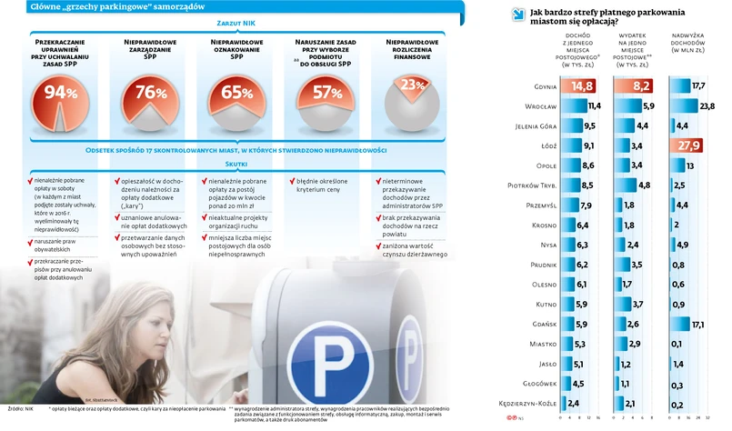 Efekt? W 16 z 17 skontrolowanych miast działania związane z organizacją odpłatnych miejsc podejmowane były „z naruszeniem obowiązujących przepisów”. W 13 z nich oznakowanie obszaru SPP było niezgodne z przepisami ustawy – Prawo o ruchu drogowym, zatwierdzonymi projektami organizacji ruchu i zasadami określonymi w ministerialnym rozporządzeniu w sprawie znaków. – W skrajnych przypadkach nieprawidłowości podważały legalność pobieranych przez miasta opłat za postój pojazdów w strefie – ocenia NIK.