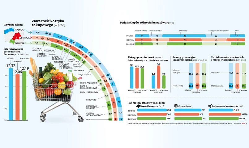Północ jest też najlepszym miejscem do sprzedaży papierosów i alkoholu. Kupuje się tam również najwięcej owoców i warzyw. Na południu najszybciej ze sklepów znika pieczywo i słodycze. Centrum zamiast łączyć, dzieli kraj pod względem preferencji zakupowych. Jego mieszkańcy wydają najwięcej na mięso, ryby oraz kosmetyki i artykuły higieniczne.