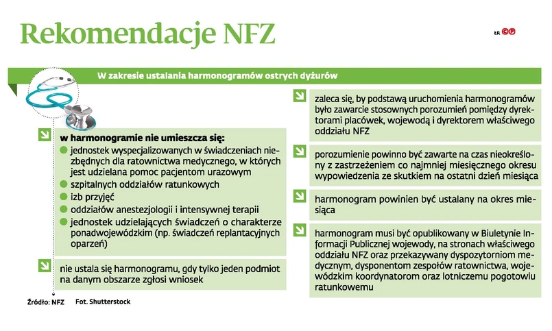 Potwierdzają to informacje od wojewodów. Łódzki urząd podkreśla, że z założenia ewentualne wprowadzenie harmonogramów mogłoby dotyczyć jedynie szpitali z Łodzi – z uwagi na występowanie tożsamych oddziałów. Warunków do wprowadzenia systemu dyżurów naprzemiennych nie ma – w ocenie tamtejszego wojewody – w województwie kujawsko-pomorskim. Trudne byłoby to także w woj. warmińsko-mazurskim. – Wydaje się, że harmonogram mógłby powstać dla laryngologii i okulistyki, jednak wnioskodawcą musi być dany podmiot leczniczy. Jeśli chodzi o inne oddziały – teoretycznie jest to możliwe, lecz skomplikowane, np. z uwagi na odległości pomiędzy szpitalami w terenie oraz liczbę pacjentów w szpitalach w Olsztynie czy Elblągu – tu jeden lekarz na dwóch oddziałach może okazać się niewystarczający – ocenia Krzysztof Kuriata, dyrektor wydziału bezpieczeństwa i zarządzania kryzysowego w tamtejszym urzędzie wojewódzkim.