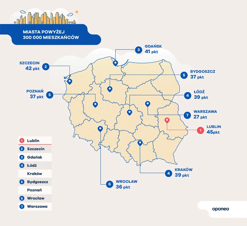 W grupie miejscowości do 300 000 mieszkańców po raz drugi z rzędu zwyciężyły Kielce. Atrakcyjnie dla kierowców wypadły również śląskie miasta – Sosnowiec, Gliwice i Katowice. Jakie miasta wypadły najgorzej w rankingu Oponeo? Nie popisała się przede wszystkim Gdynia, której rezultat, zaledwie 28 punktów, zdecydowanie odstawała od reszty. Wiele do poprawy ma również Toruń i Radom.