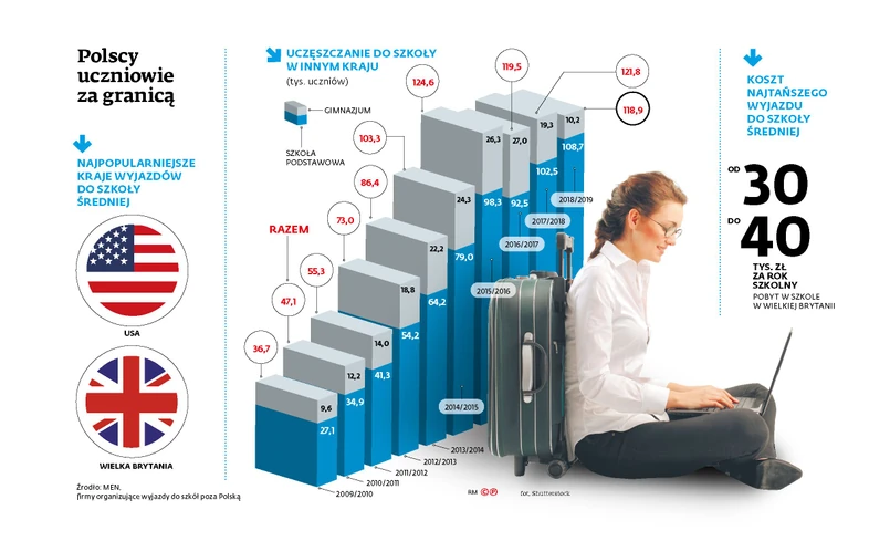 O tym, że coraz więcej dzieci uczy się w innych krajach, świadczą też dane MEN. Resort zbiera jedynie informacje o dzieciach w podstawówkach i gimnazjach. W roczniku 2009/2010 do szkoły podstawowej lub gimnazjum za granicą uczęszczało 36,7 tys. dzieci. W ubiegłym roku było ich już 118,9 tys. Dlaczego ta liczba wzrasta? Jednym z powodów, zdaniem ekspertów, jest to, że dorastają dzieci emigrantów zarobkowych, którzy wyjechali z kraju po wejściu Polski do UE i otwarciu granic. – Mamy przypadki, że rodzice zostawili małe dzieci z dziadkami, a kiedy te osiągają wiek szkolny, ściągają je do siebie. Pomagamy czasem przy wyborze szkoły – potwierdza Monika Astrabas. Większość z nich może zostać za granicą. Do powrotu mogą je zniechęcać także ciągłe zmiany w polskich szkołach. ©℗