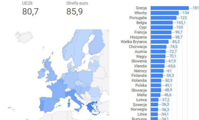 Od lat liderami zadłużenia są Grecja i Włochy. W pierwszym kwartale bieżącego roku było podobnie. W Grecji na koniec pierwszego kwartału wskaźnik długu publicznego w relacji do PKB wynosił 181,9 proc., a we Włoszech zadłużenie sięgało poziomu 134,0 proc. PKB. Długi na poziomie powyżej 100 proc. PKB miały jeszcze: Portugalia (123,0 proc. PKB), Belgia (105,1 proc.) i Cypr (105,0 proc.). Na granicy 100 proc. znalazły się Francja (99,7 proc.) i Hiszpania (98,7 proc.)