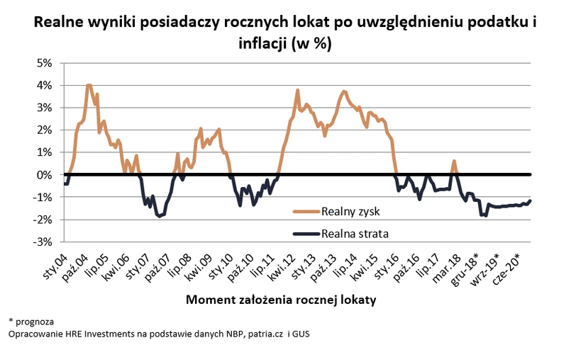 W sumie więc mówimy już o ponad 5 latach realnych strat na lokatach. Po prawdzie w okresie tym zdarzył się jeden epizod, w którym posiadacze rocznych lokat mogli zamiast strat notować zyski. Był to jednak swoisty wypadek przy pracy. W dużej mierze wynikał on z rządowej interwencji na rynku energii elektrycznej. To dzięki niej inflacja w styczniu i lutym 2019 roku była dość skromna wynosząc odpowiednio 0,7% i 1,2%. Dzięki tak niskim wynikom nawet rachitycznie oprocentowanym lokatom założonym rok wcześniej udało się przynieść swoim posiadaczom realny - choć bardzo skromny - zysk.