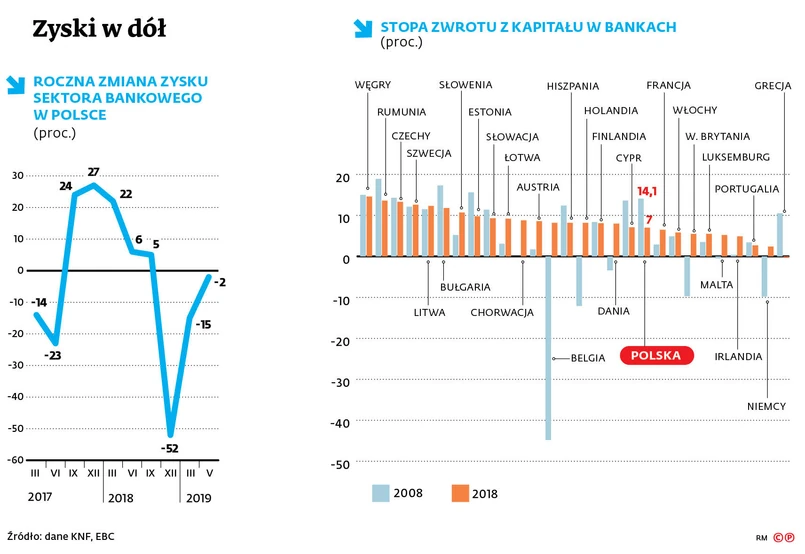 W skali całego sektora już w I kwartale odpisy na utratę wartości aktywów wyniosły 2,1 mld zł. Były o niemal jedną piątą wyższe niż rok wcześniej. W kolejnych dwóch miesiącach (danych za cały kwartał jeszcze nie ma) wzrost odpisów wyniósł 7 proc. Rezerwy pomniejszają wynik finansowy. W I kwartale zysk całego sektora bankowego w Polsce wyniósł niespełna 2,9 mld zł. Był o 15 proc. mniejszy niż rok wcześniej. Początek roku jest pod tym względem najsłabszy ze względu na konieczność zaksięgowania składek na Bankowy Fundusz Gwarancyjny. W II kwartale składki są już mniejsze i wystarczyły kwiecień i maj, by osiągnąć prawie 3 mld zł zysku. Nadal nie ma jednak mowy o wzroście.