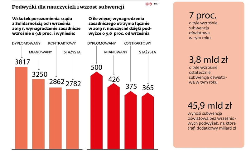 Ekstra pieniądze do samorządów trafią jednak przede wszystkim na 9,6 proc. podwyżki, która powinna być wypłacana tuż po wakacjach. Zgodnie bowiem z art. 14 ust. 2 ustawy z 13 czerwca 2019 r. o zmianie ustawy – Karta nauczyciela oraz niektórych innych ustaw (Dz.U. poz. 1287) – dyrektorzy szkół powinni najpóźniej do końca września wypłacić ekstraświadczenia z wyrównaniem od 1 września. W tym samym czasie nauczyciele stażyści odbywający staż na stopień nauczycieli kontraktowych otrzymają jednorazowo świadczenie na start w wysokości 1000 zł brutto. Jak przekonywał Dariusz Piontkowski, na ten dodatek ma być zagwarantowane 24 mln zł.