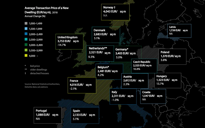 Według Deloitte w Polsce w 2018 roku za metr kwadratowy nowego mieszkania płacono średnio 1 370 euro, czyli o 3,8 proc. więcej niż rok wcześniej. Spośród analizowanych krajów taniej jest tylko na Węgrzech i w Portugalii. Najdrożej zaś we Francji, Niemczech i Wielkiej Brytanii.