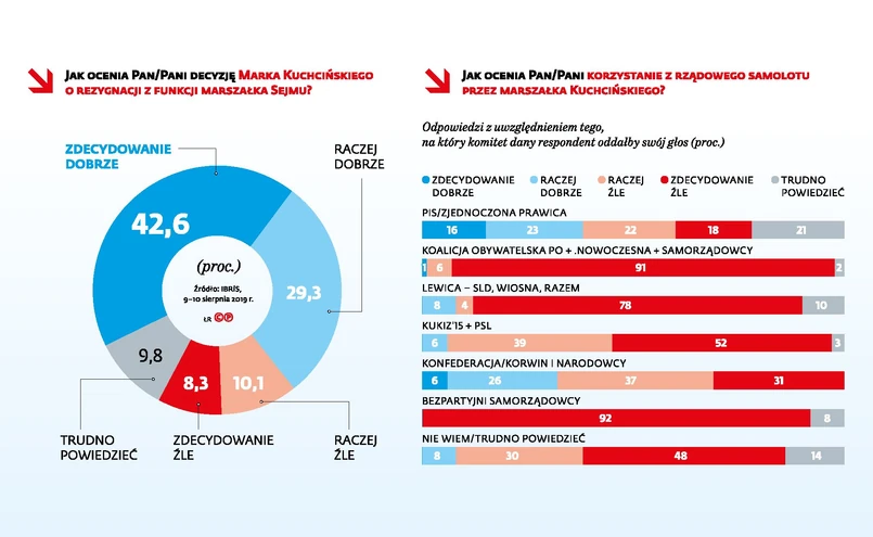 badania IBRiS dla DGP i RMF FM. Kluczowe jest jednak pytanie, na ile ten gest satysfakcjonuje wyborców, zwłaszcza tych głosujących na PiS. Dla 42 proc. z nich samo ustąpienie dotychczasowego marszałka Sejmu nie kończy sprawy, choć w dalszym ciągu większość (55 proc.) sądzi, że to wystarczający gest ze strony obozu władzy. Dalszego drążenia tematu lotów rządowymi samolotami najbardziej domagają się wyborcy Koalicji Obywatelskiej (82 proc. uznaje, że dymisja marszałka nie zamyka sprawy).