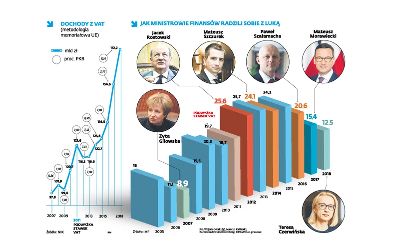 Za rządów PO i PSL luka w VAT (różnica między tym, co powinno trafiać do budżetu państwa z tego podatku, a tym, co rzeczywiście trafia) zwiększyła się z niespełna 9 proc. w 2007 r. do ponad 25 proc. w szczytowym momencie lat 2012– 2013. Później nieco spadła, ale jej wyraźne obniżenie widać dopiero od 2016 r.