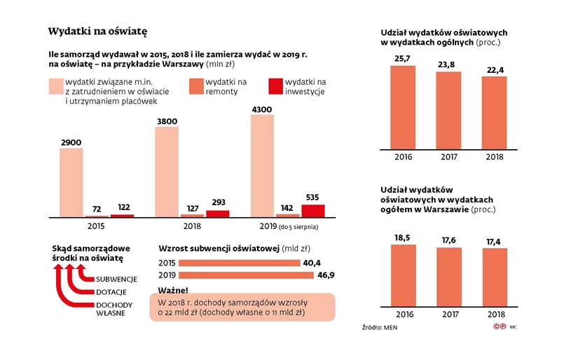 W ostatnich latach w pierwszej kolejności samorządy musiały wydawać pieniądze na inwestycje i remonty. Na przykład w Tychach w 2015 r. na oświatę wydano ponad 191 mln zł, w tym będzie to łącznie 260 mln zł. We Wrocławiu w 2015 r. było to 1 mld 100 mln zł, obecnie to o 200 mln zł więcej. Kwota na same remonty wzrosła z 11 do 17 mln zł. W Częstochowie kwota poszybowała z 380 mln zł do 467 mln zł. Remonty w tym roku pochłoną tam ponad 17 mln zł, najwięcej od czterech lat. W Olsztynie na oświatę wydaje się 475 mln zł, o 144 mln zł więcej niż w 2015 r.