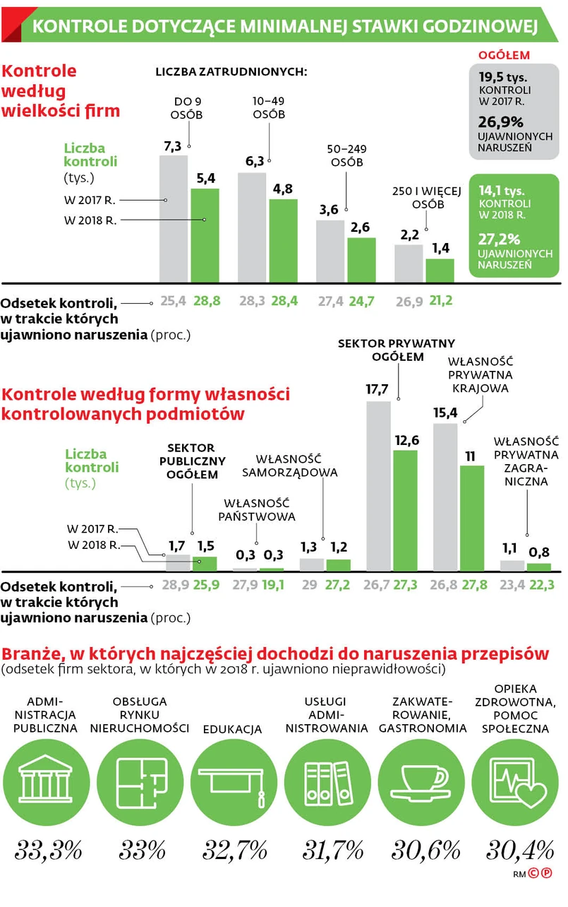 W 2018 r. Państwowa Inspekcja Pracy przeprowadziła 14,1 tys. kontroli dotyczących minimalnej stawki godzinowej, w tym 5,4 tys. w mikroprzedsiębiorstwach (zatrudniających do dziewięciu osób). Najczęściej ujawniane nieprawidłowości polegały na nieustalaniu liczby godzin pracy na zleceniu lub umowie o świadczeniu usług (wykazało je 11,5 proc. kontroli) oraz niewypłacaniu wynagrodzenia co najmniej raz w miesiącu (8,5 proc.). Rzadziej dochodziło do przypadków zaniżania lub niewypłacenia stawki. – Te dane nie są jednak do końca miarodajne. W Polsce funkcjonuje ok. 3 mln mikrofirm, a sprawdzono jedynie 5,4 tys. z nich. To może oznaczać, że skala problemów jest większa – zauważa Norbert Kusiak, dyrektor wydziału polityki gospodarczej oraz funduszy strukturalnych OPZZ.