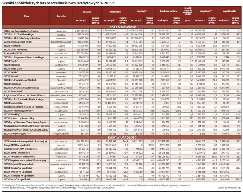 Nasze zestawienie nie uwzględnia wyników SKOK Jaworzno, który na początku roku został przyłączony do Alior Banku. Zgodnie z informacją KNF, na koniec listopada ub.r. ta kasa miała aktywa na poziomie niemal 284 mln zł i prawie 60 mln zł ujemnych funduszy własnych.